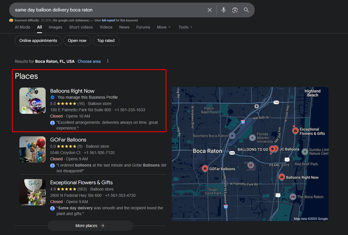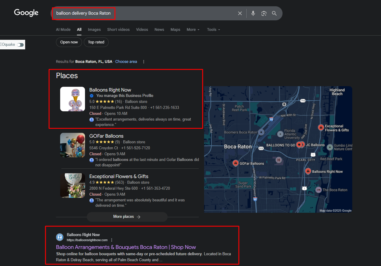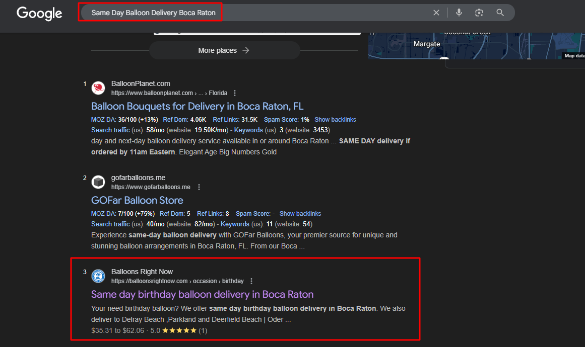 #1 position achieved – Ranked for “Same day balloon delivery Boca Raton,” dominating local searches.